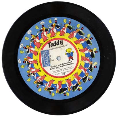 Als laatste noem ik dan nog een aantal platen die opvallen door het “totaalconcept”: in de jaren ’50 zijn er een aantal 78-toerenplaten uitgegeven onder de naam Teddy GrammoVisie. Dat waren plaatjes (waar ik nog steeds een paar van zoek) die je met een bijpassend carrousel-spiegeltje op de draaitafel moest afspelen. Op het plaatje zelf waren illustraties die in een bepaalde sequentie stonden. Door nu in het spiegeltje te kijken tijdens het draaien kreeg je een soort animatie-idee. Erg bijzonder!